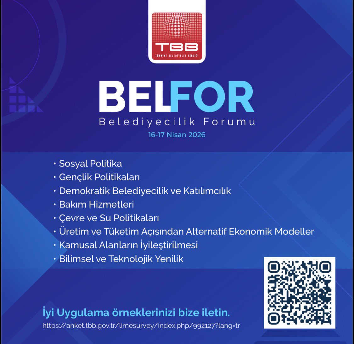 Forum kapsamında, belediyelerin yerel ölçekte toplumsal fayda üreten ve kent yaşamının niteliğini artırmayı hedefleyen iyi uygulamalarının paylaşılması amaçlanıyor. Bu doğrultuda, farklı alanlarda geliştirilen yenilikçi yaklaşımlar ve uygulama örnekleri forum programında yer alarak belediyeler arasında deneyim paylaşımına katkı sunacak.